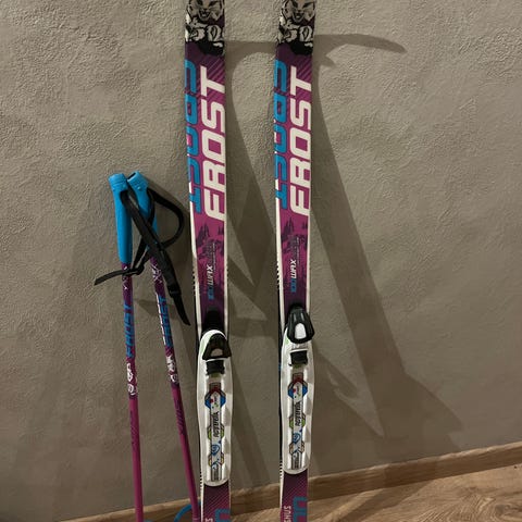 Madshus superkid smørefrie langrennski (100cm) med Rottefella NNN binding og Swix Frost staver (70cm).