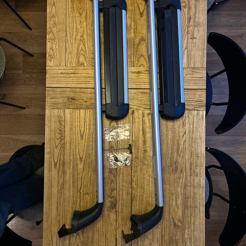 Whispbar takstativ med tilhørende monteringsutstyr. Settet inkluderer to takstativstenger i aluminium med svarte endedeksler, samt diverse monteringsklips og skruer for installasjon. Passer for bruk på biler som trenger ekstra lastkapasitet på taket.Whispbar takstativ til Tesla modell S i aluminium. Settet er komplett og inkluderer monteringsdeler og nøkkel