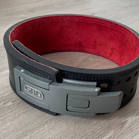 SBD Vektløfterbelte i lær med svart utside og rød innside. Størrelse medium.