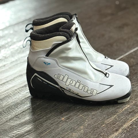 Alpina skisko i størrelse 39 med svart og sølv farge. Skiskoene har glidelås foran og er laget med materialer som gir støtte og beskyttelse for foten under bruk.