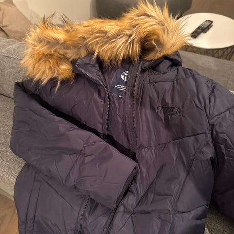 Svea Vinterjakke for jente i størrelse 170. Jakken er mørk blå og laget av nylon med polyesterfyll. Den har hette og glidelås foran. Passer til bruk som yttertøy i kalde årstider. Pent brukt.