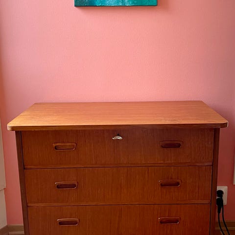 Teak gammelt nattbord fra 60-70 tallet. Diverse merker , hakk og slitasje så det trengs vel en pleiende hånd for å få det i fullgod stand. Noe slitasje i ene hjørnet av bordplate som synlig på bilde. Samlerobjekt kanskje ? Antikvarisk verdi. Har vært i familie siden det var nytt. Kan hentes på Laksevåg/ Melkeplassen.