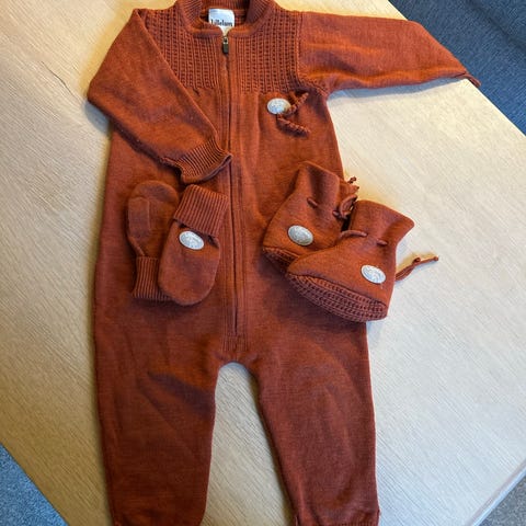 Lillelam ullsett med jakke, lue og votter. Gul i størrelse 80