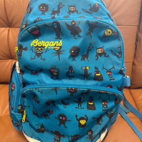 Bergans ryggsekk for barn. Den er godt brukt, men hel. Bryststroppen er byttet og er ikke original. Regntrekk med refleks følger med.