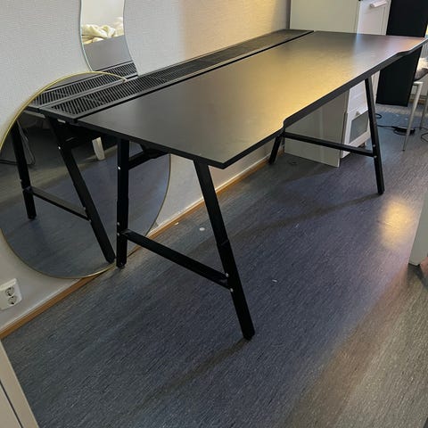Stort bord som kan brukes som både skrivebord, pc-bord og spisebord. 2 kroker medfølger for oppheng av f.eks. headset eller veske. Krokene kan tas av dersom de ikke vil brukes. Bordet er pent brukt og har ingen bruksmerker. Nypris kr 2500