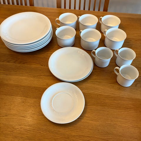 Nydelige og delikate espresso kopper i serien A La Carte fra Rørstrand. Helt hvite og tynne i godset. Høyde 5,6 cm, Ø = 6 cm i åpningen. Ingen skader eller krakeleringer, ser helt nye ut. Samlet pris for seks kopper med skåler: 450 kr. Kan ev. sende med PostNord til 69 kr.