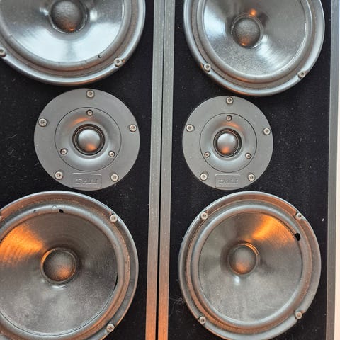 Sony Hi-Fi-anlegg med tilhørende høyttalere. Systemet inkluderer en forsterker og flere høyttalere i forskjellige størrelser