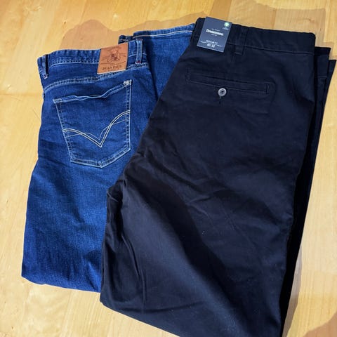 Selger et par Chinos i farge khaki / beige. Livvidde 40 tommer, lengde på ben (fra skrittet og ned) 36 tommer (W40 L36). Buksene er av type regular fit / stretch. Buksene er helt nye med alle lapper / labels fortsatt på. Setter derfor prisen deretter.