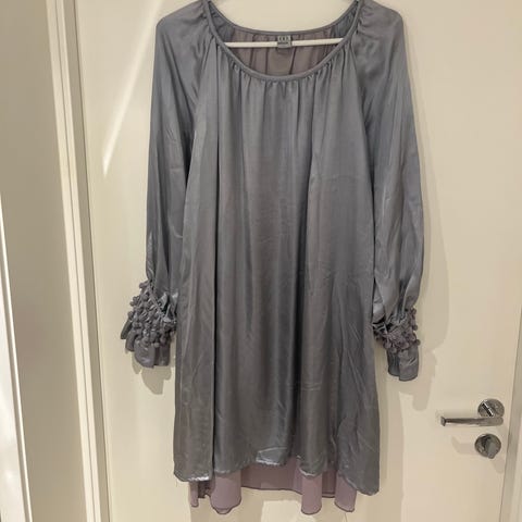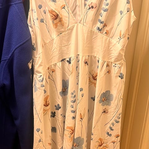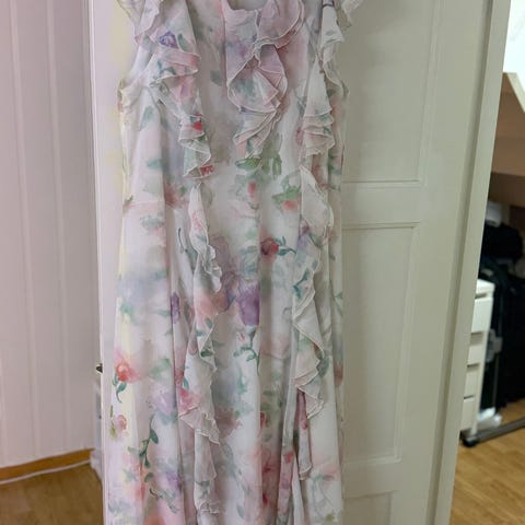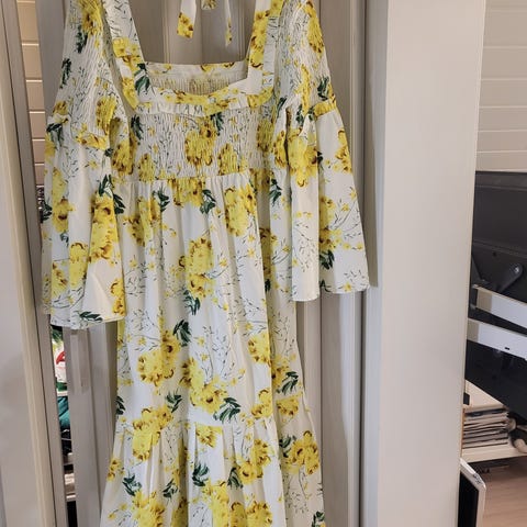 Hostandvar Dress Lilje Yellow Flower kjole i størrelse L. Kjolen har et mønster med gule blomster og er designet for kvinner.aldri brukt.sendes mot frakt.