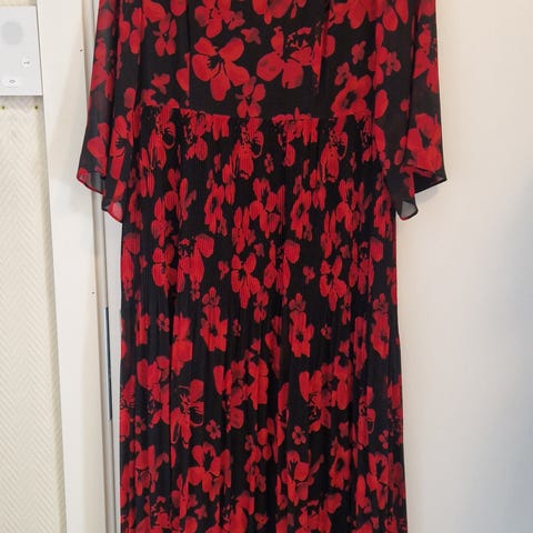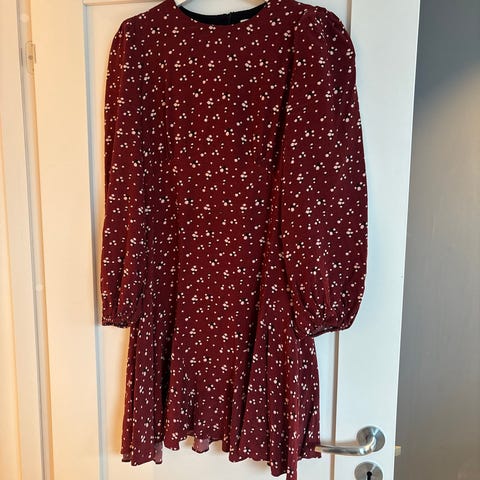 Kjole fra NORR i str M. Kjolen er mørk blå og rød/oransje . Knapper foran, volanger og fastsydd underkjole.