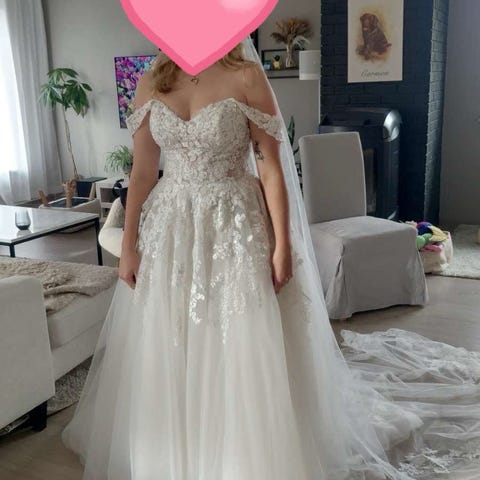 Kjolen er brukt én gang og fremstår like fin som ny. Det er gjort enkle justeringer av skredder (kjolen er klippet litt i lengden og den er sydd noe inn i livet). Den er renset og klar for ny brud.