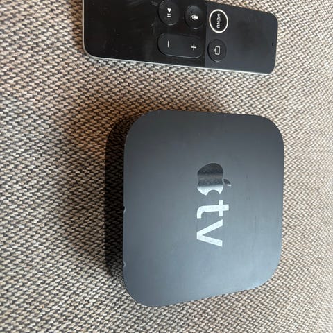 Apple Apple TV digital mediespiller med fjernkontroll. Enheten har HDMI-utgang, optisk digital lydutgang og Ethernet-port for nettverkstilkobling. Designet for å strømme digitalt innhold til TV.