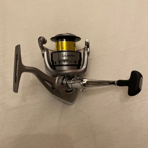 Daiwa Exceler 2500 spinnhjul med roterende håndtak og metallspole. Egnet for fiske med middels til lett utstyr.