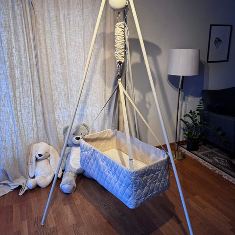 « Tova bedside crib lar babyen sove trygt helt inntil deg, slik at nattamming og trøst går enklere. Sengen trilles på plass ved siden av foreldresengen, festes med medfølgende bånd og kan justeres i fem nivåer for god tilpasning. Den nedfellbare langsiden gir nærhet uten løfting over kant, og de luftige mesh-panelene gir både innsyn og god ventilasjon. Når dere skal bort eller vil rydde den bort, foldes den raskt sammen og legges i transportbagen»