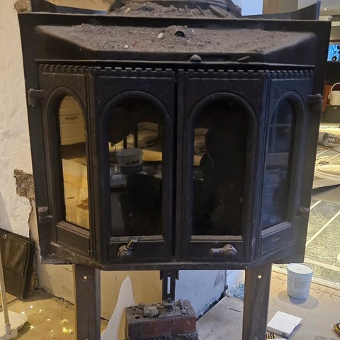 Solid svart vedovn peisinnsats i støpejern selges billig. Demontert og klar til å hentes.