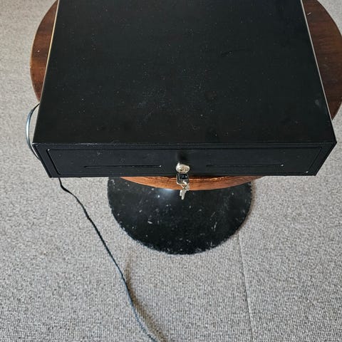Kassaskuff for kontanthåndtering. Utstyrt med flere rom for mynter og sedler.
