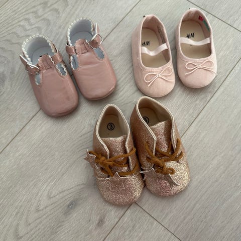 Har to par pensko til jente str 18 og 19. Eg kjøpte dei nye, og jentene våre har kun hatt dei på under fotografering innendørs ca 30 min. Kjøpt nye for 499 kr per par.