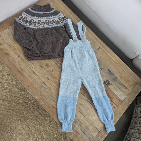 Strikket sett med bukse og genser + tilhørende tilbehør