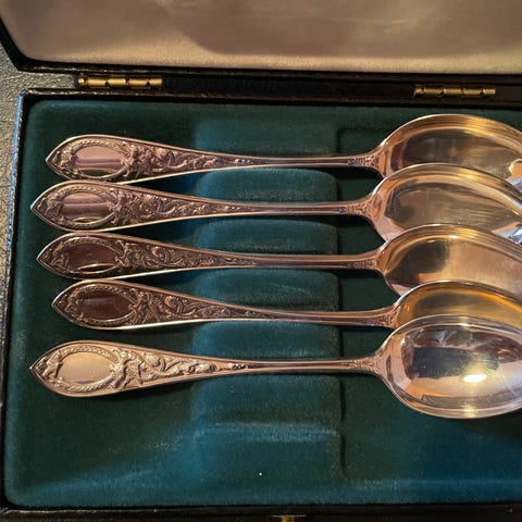 Seks av skjeene er stemplet med 23 KARAT GOLD PLATED, som betyr at de har et tynt overflatelag av ekte 23-karat gull. Resten er identiske, men uten stempel. Selges samlet for 450kr inkludert den antikke esken.