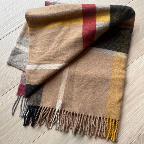 Stort og mykt skjerf i naturfarger. Jeg har klippet av lappene, men mener merket var Pieces og at det antakeligvis er laget av polyester ut fra tilsvarende produkter. Veldig lite brukt og framstår som nytt.
