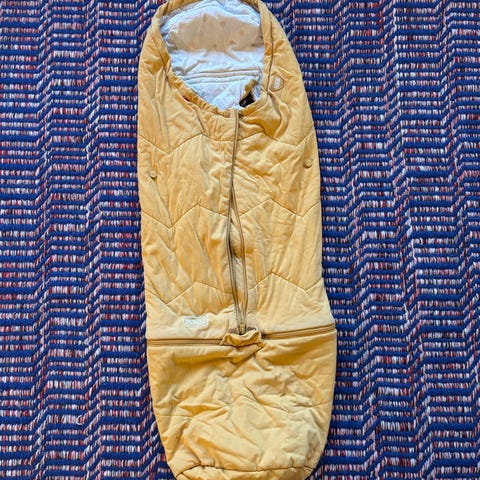 Godt brukt men fortsatt veldig varm og praktisk vognpose i lammeskinn. Glidelåsen er litt skadet i den ene enden, men det påvirker ikke funksjonen siden posen lukkes og åpnes lett.