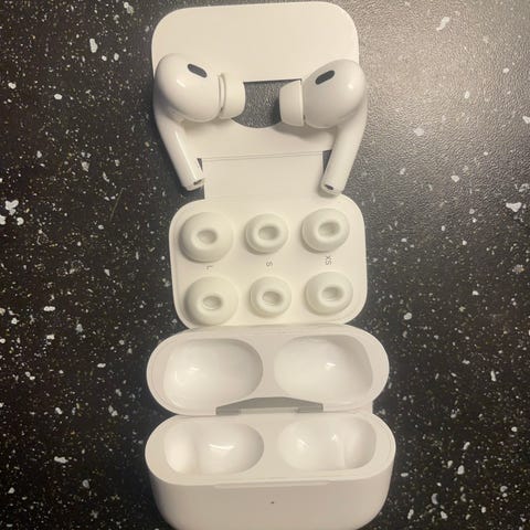 Apple AirPods Pro gen 2 selges. Leveres med ladeetui, aktiv støydemping og tilpasset passform.