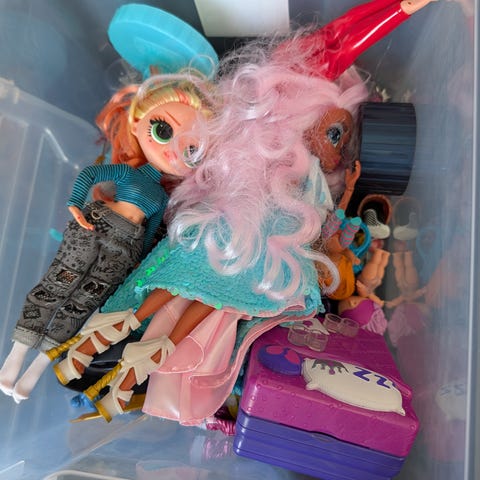L.O.L Surprise dukke med lilla hår, iført rosa badedrakt og nettingstrømper. Dukken har bevegelige armer og ben.