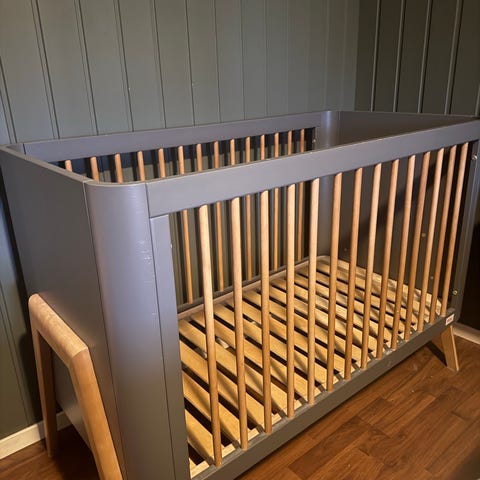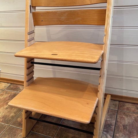 Stokke høy barnestol laget i tre. Original fra 80-tallet. Stolen har en naturlig trefinish og inkluderer sikkerhetssele og avtagbar frontstang. Den er pusset ned en gang og oljet, men denne oljen er trukket godt inn, og ser delvis ubehandlet ut. Kan bli riktig fin med litt DIY.