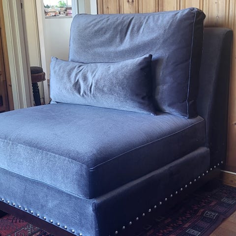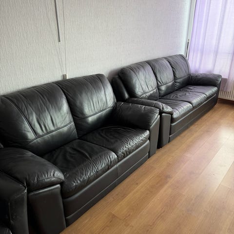 Pen brukt sofa/lenestol sammen med 2 putter i mørke grå farge