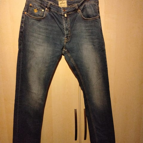 Selger pent brukte Morris bukser i str W30 L32. De heter Steve Satin Jeans og er blå med noen gule detaljer, ingen synlige bruksmerker