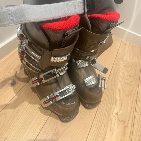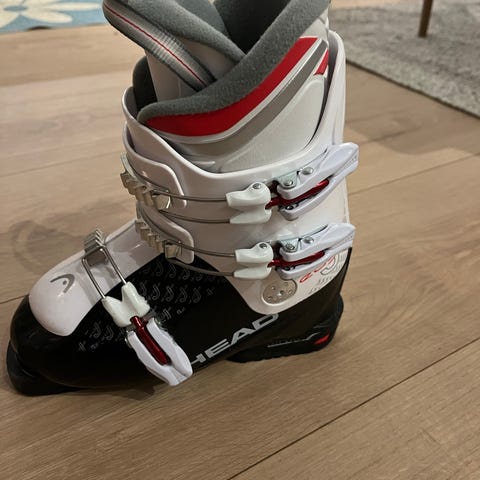 Head skistøvler i størrelse 23,5 som også tilsvarer 36,5. Støvlene har to røde spenner for justering og en solid såle.