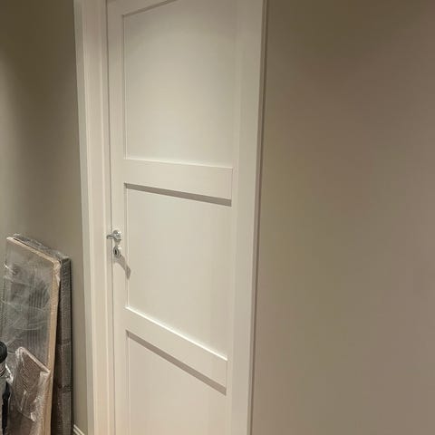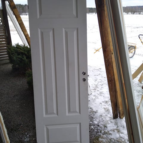slett hvit lettdør. kjøpt på byggmakker ved en feil kjøpte vi to. karm medfølger ikke. uåpnet i pappen, med kvittering. nypris 2600,-, spesialmål fra 50-tallshus.