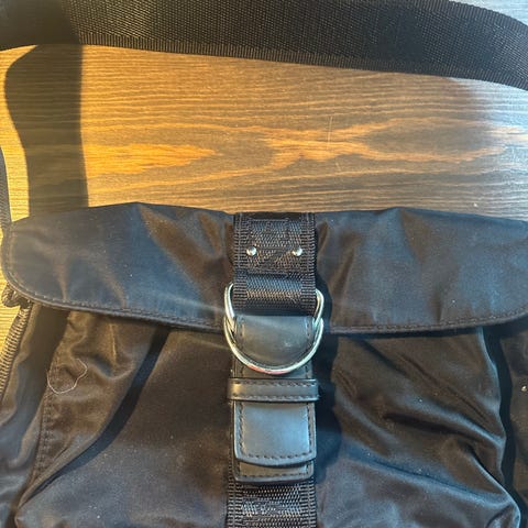 Ralph Lauren dame veske laget av stoff. Vesken har en enkel design med to skulderstropper og glidelåsåpning. Innvendig rom med mindre lommer for oppbevaring.