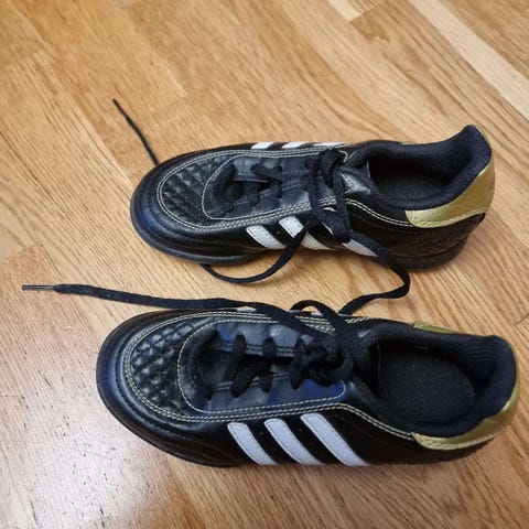Pent brukte Adidas fotballsko / innesko selges. Klassisk Adidas-design i svart med hvite striper. Skoene er lette og behagelige, og passer godt til fotball, gym eller annen innendørs aktivitet.