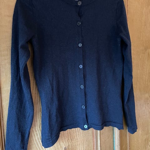 Peppercorn cardigan i ull, farge lilla, størrelse M. Plagget er laget for kvinner og har knappelukking foran,Knappene er veldig spesielle; de er laget av naturlige skjell. Materialet er ull, som gir varme og komfort.