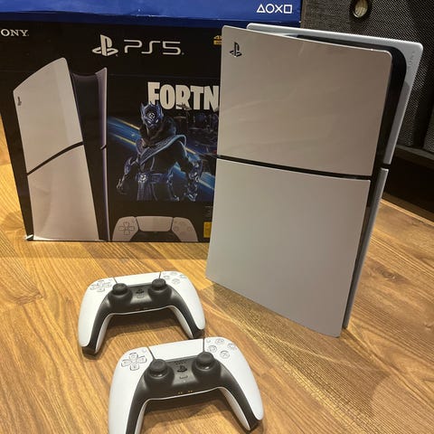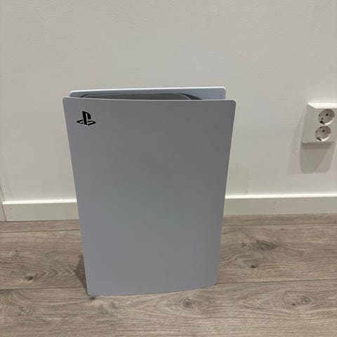 Selger en Playstation 5 digital med tre kontrollere, trådløst platinum PlayStation headset, stativ så konsollen kan ligge, diverse tommel knotter for bedre grep, og ett stativ til én kontroller.