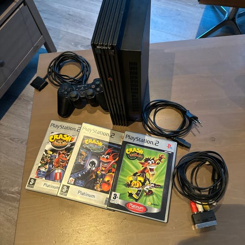 Sony PlayStation 2 konsoll med spill og kontroller