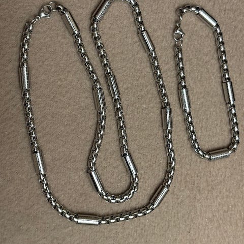 Nytt ubrukt Smykke sett halskjede og armbånd i rustfritt stål.Til Herrer.Str.Kjedet er 64.cm langt og armbåndet er 21.cm langt.