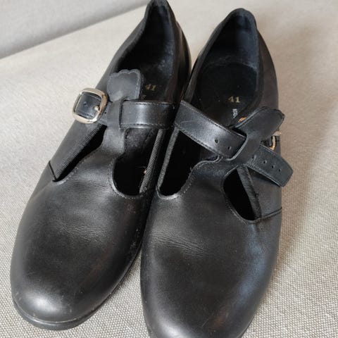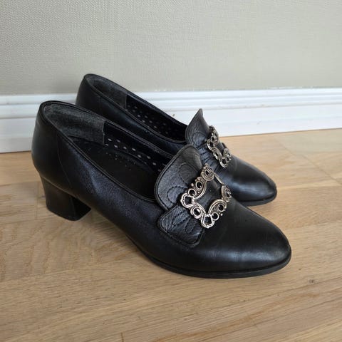 Godt brukte men brukbare bunadssko i størrelse "fire og en halv" som tilsvarer ca. 35/36. Skoene måler 23,5 cm. fra tåspiss til øvre hælkappe. De tåler nok fint et par sesonger til, og kanskje enda mer med litt flikking.