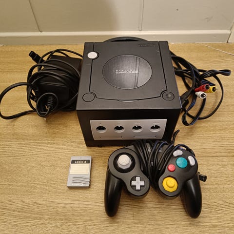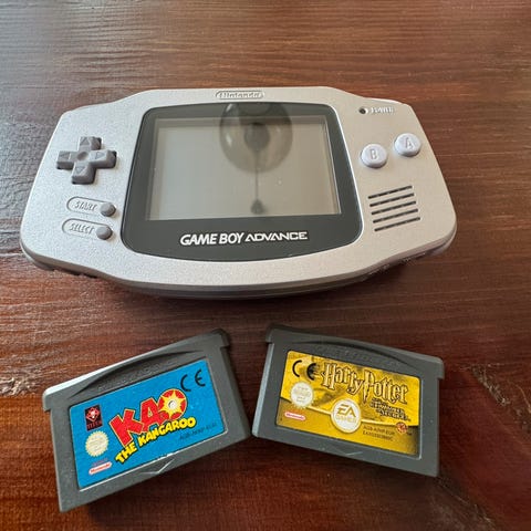 Lilla Gameboy Advance med spillet Spider-Man: Mysterio's Menace. Spillet selges løst uten eske. Selges samlet.