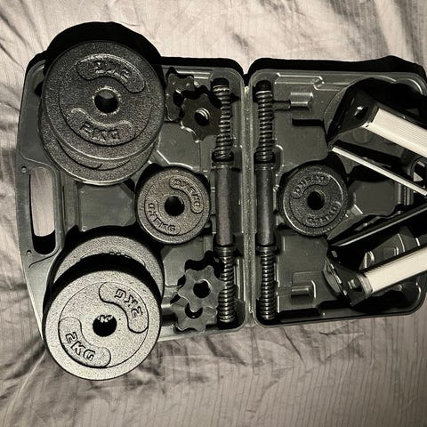 Koffert med 14 kg i vektskiver samt to lange vektstenger som veier 2 kg hver, lås inkludert. Sammenlagt vekt er 18 kg.