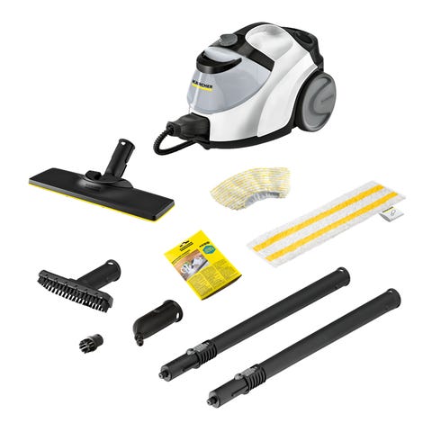 Kärcher SC 4 EasyFix dampvasker med kontinuerlig påfylling av vann, inkludert tilbehør som gulvmunnstykke, håndmunnstykke, forlengelsesrør, og diverse børster. Egnet for rengjøring av harde gulv og ulike overflater ved bruk av damp.