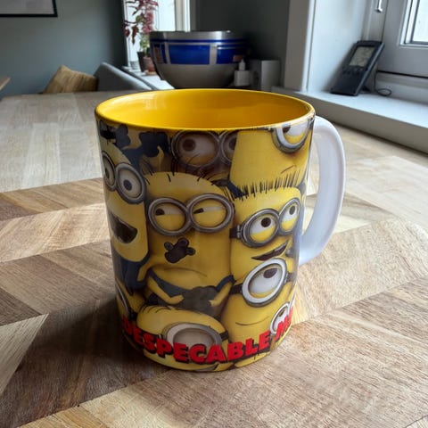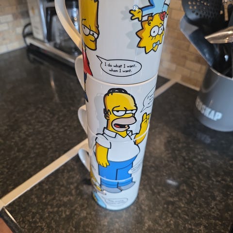 The Simpsons krus med motiv av karakterene Homer og Lisa Simpson. Keramisk materiale med fargerikt trykk. Krusene har synlige skader med fliser og sprekker.