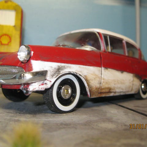 Modellbil Blå Vintage Bil på Treplate med Miniatyrtrær