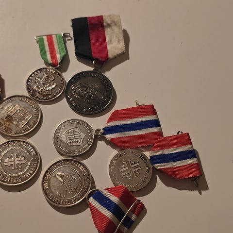 Kongehuset emblem i gullfarget metall. Rundt emblem med krone på toppen og bokstaven V i midten, omgitt av en laurbærkrans. Passer til dekorasjon eller samling.