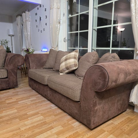IKEA Ektorp 3-seter sofa med tilhørende lenestol og puff i beige farge. Settet har trekk i stoffmateriale og er designet for stuebruk. Sofaen og lenestolen har polstrede armlener og ryggputer, mens puffen kan brukes som fotstøtte eller ekstra sitteplass. Puffen har oppbevaringsplass under lokket. Det medfølger også et ekstra sett med trekk til alle enheten i grått.