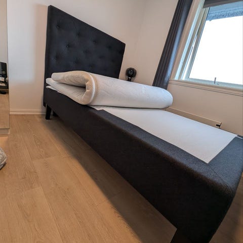 IKEA seng med svart polstret hodegjerde og hvit madrass