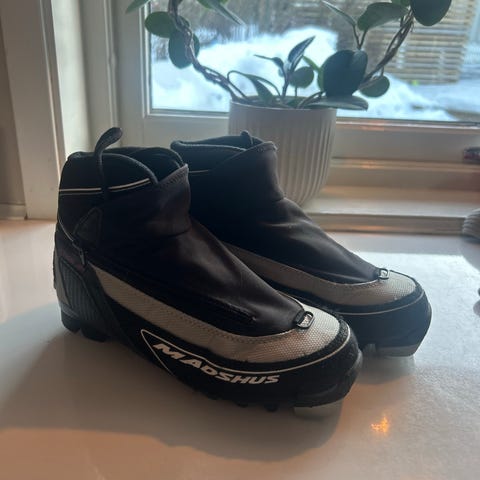 Madshus støvler til langrennski i svart og sølvfarge. Støvlene har snøring med glidelås over, og solid såle med godt grep. Størrelse 31