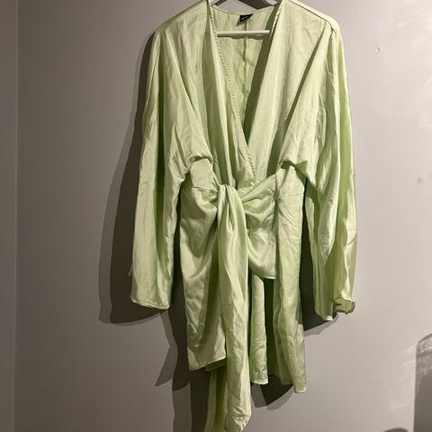 Untold Stories kjole i størrelse M. Kjolen er grønn og laget av viskose. Den har et omslagsdesign med knyting i livet. Den kan bli trang i armene til en M. Dette er en kjole som kan styles opp og ned og dermed brukes i mange ulike anledninger. Selv har jeg brukt den på jobb 🌸