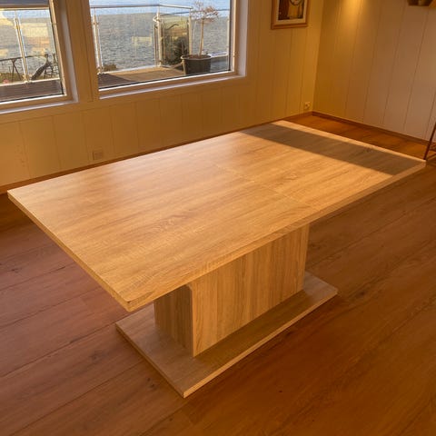 Solid spisebord vurderes å selges. Hvitt med krom ben. Kan forlenges med to klaffer til å bli 220 cm og 270 cm. Kjøpt i Oslo. Utmerket som spisebord for småbarnsfamilier/familiebord da det er veldig enkelt å vaske av.